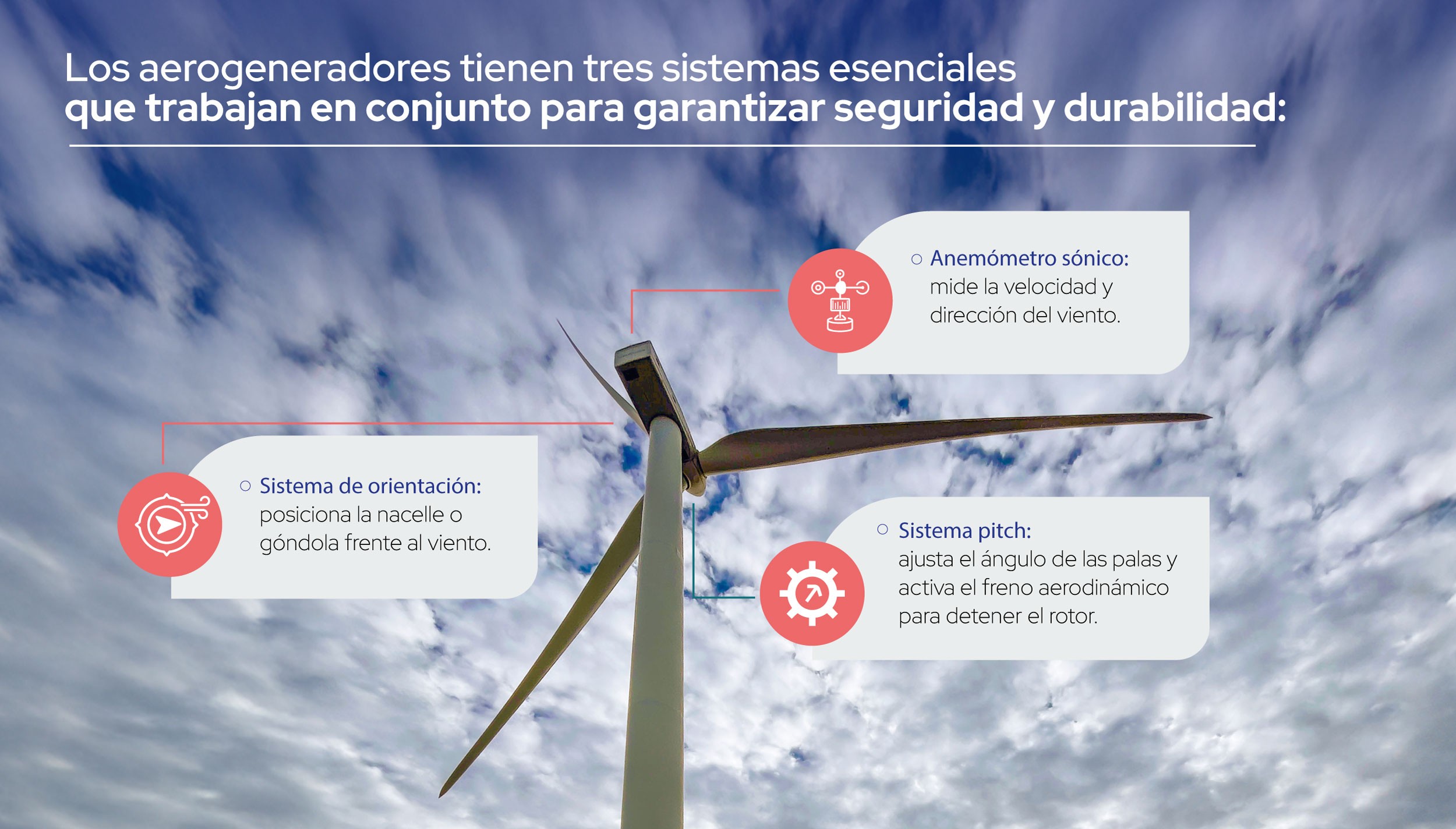 Para comenzar a producir energía, los aerogeneradores requieren una velocidad mínima de tres metros por segundo (m/s). Por debajo de ese umbral, el sistema permanece en estado de espera, con la parte eléctrica desconectada, mientras los sistemas auxiliares de comunicación, control y protección se mantienen activos, listos para reiniciar la operación cuando las condiciones sean adecuadas.